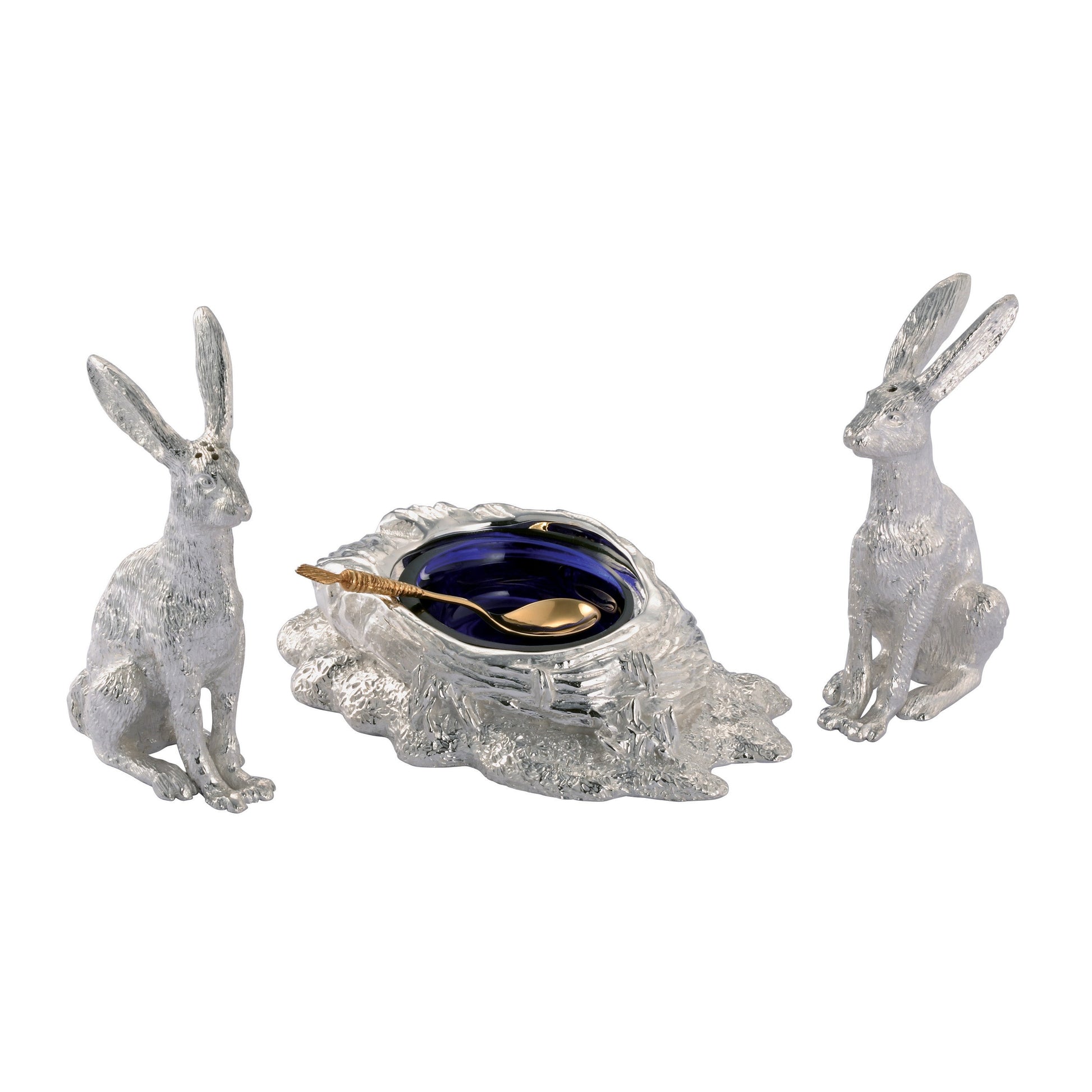 The Hare condiment set will be the talk of the table. Comprises adorable hare-shaped salt and pepper shakers, and a mustard pot with a 24K gilt interior. Also comes with a gilt spoon with a carrot-shaped handle.