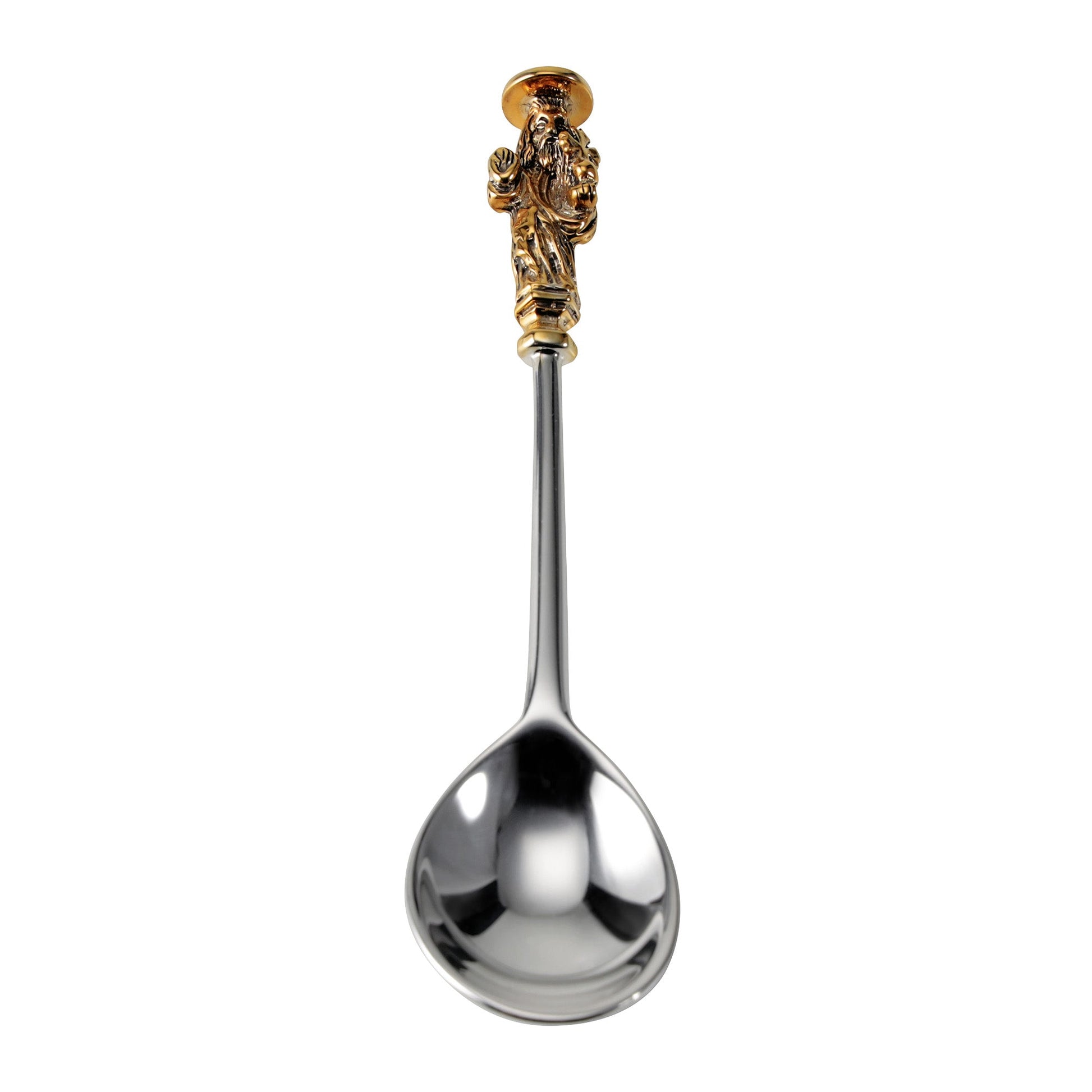 Our rare set comprises a 13th spoon; 'the Master'. The spoon's 24K gilt handle represents the figure of Christ holding an orb and sceptre in his hands.