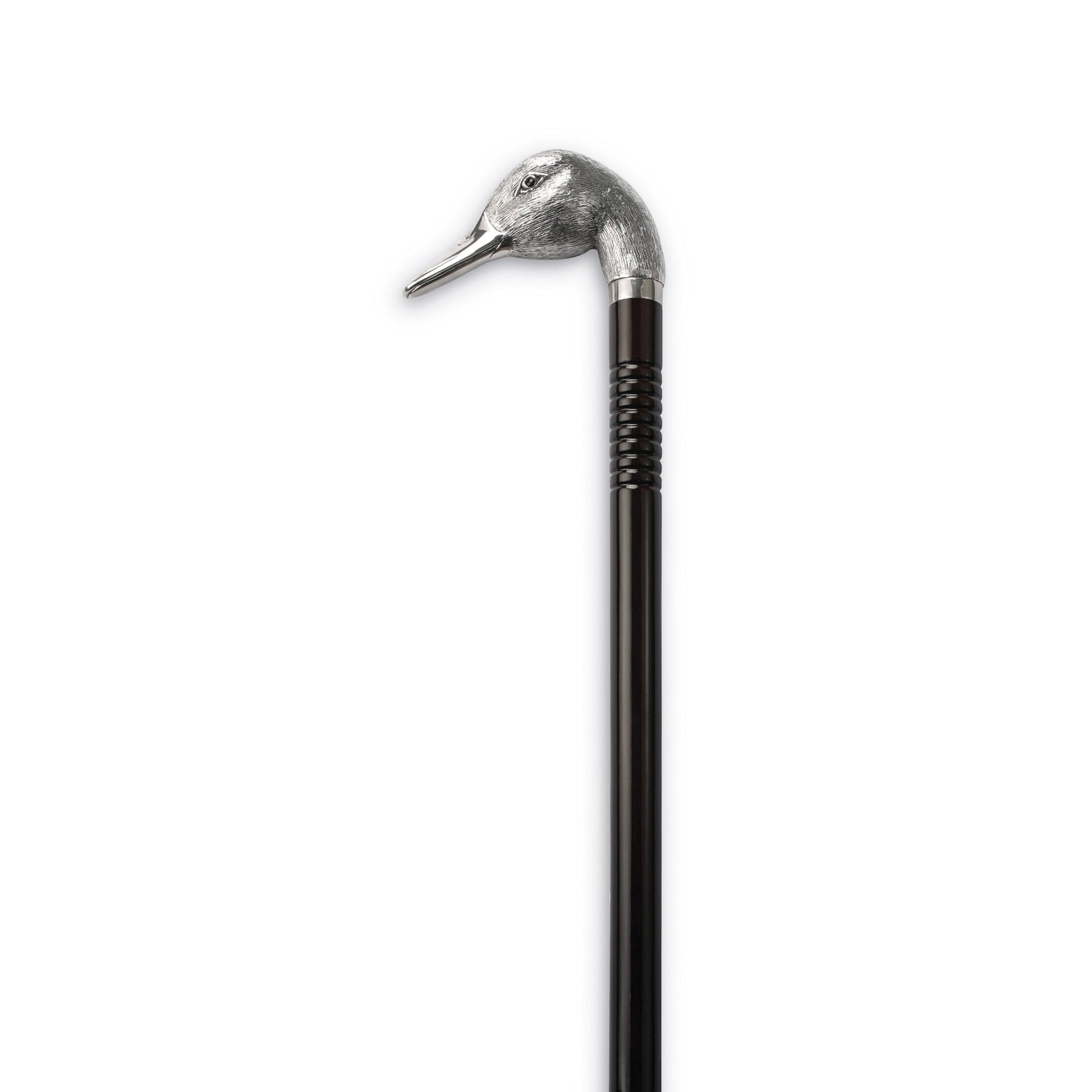 "Comyns' walking sticks are both decorative and functional and are used by many people to facilitate balance whilst walking or as a decorative accessory. The walking sticks are made from Burmese teak wood, featured here in walnut gloss. This walking stick features a sterling silvertip and neck ring, with a silver-coated handle in the shape of a duck.