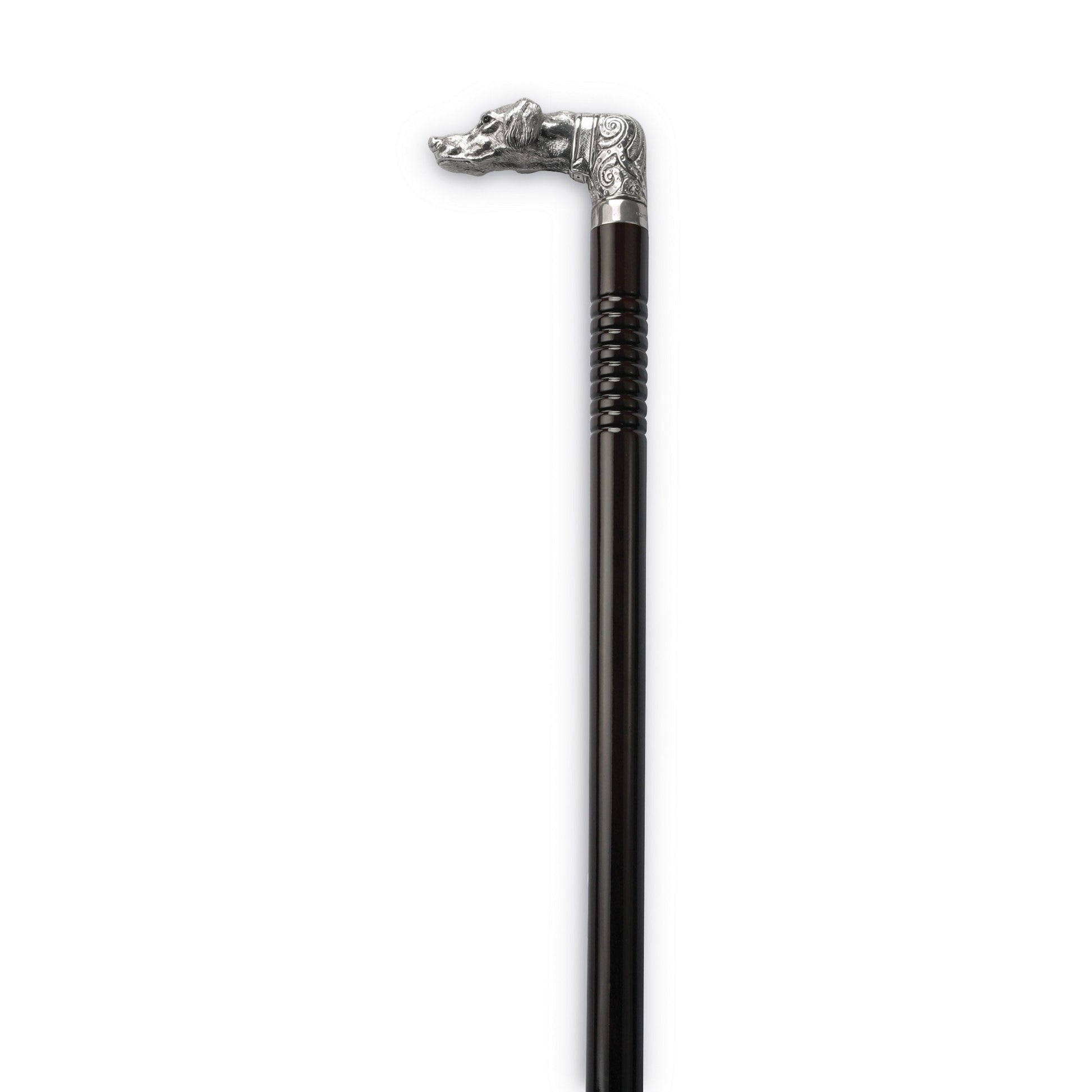 The Dog Walking Stick symbolises a loyal guardian and features sturdy construction from durable materials like a solid hardwood shaft made of Burmese teak wood in a walnut gloss finish, a sterling silvertip and neck ring, and a silver-coated filled handle.