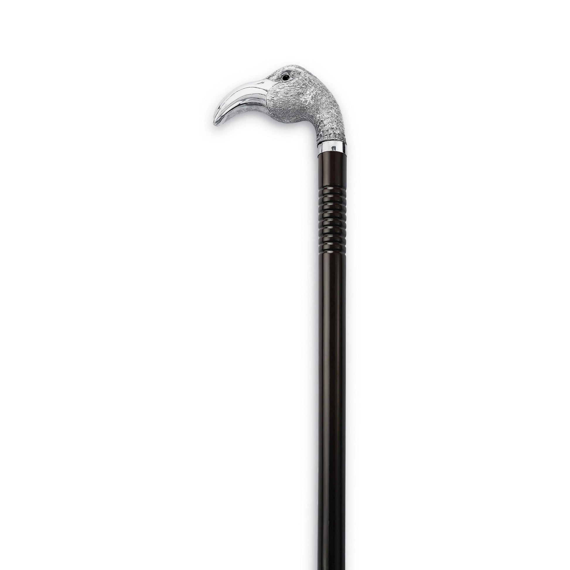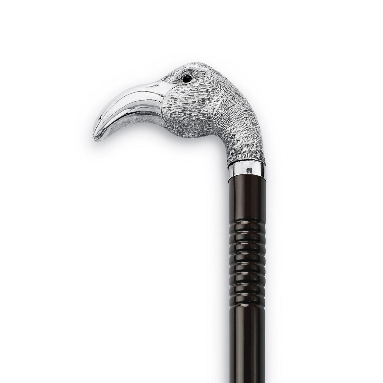"Comyns' walking sticks are both decorative and functional and are used by many people to facilitate balance whilst walking or as a decorative accessory. The walking sticks are made from Burmese teak wood, featured here in walnut gloss. This walking stick features a sterling silvertip and neck ring, with a silver-coated handle in the shape of a flamingo.