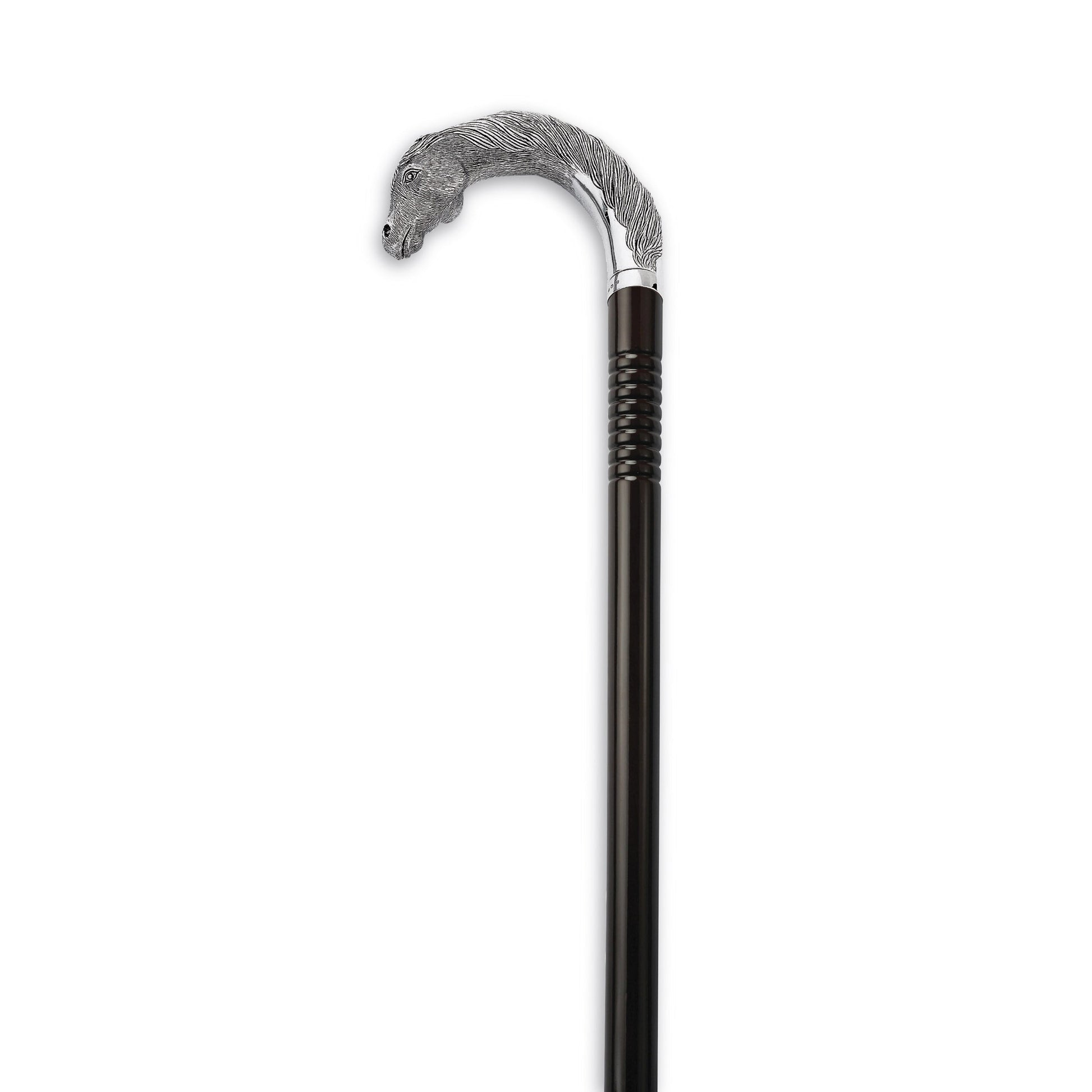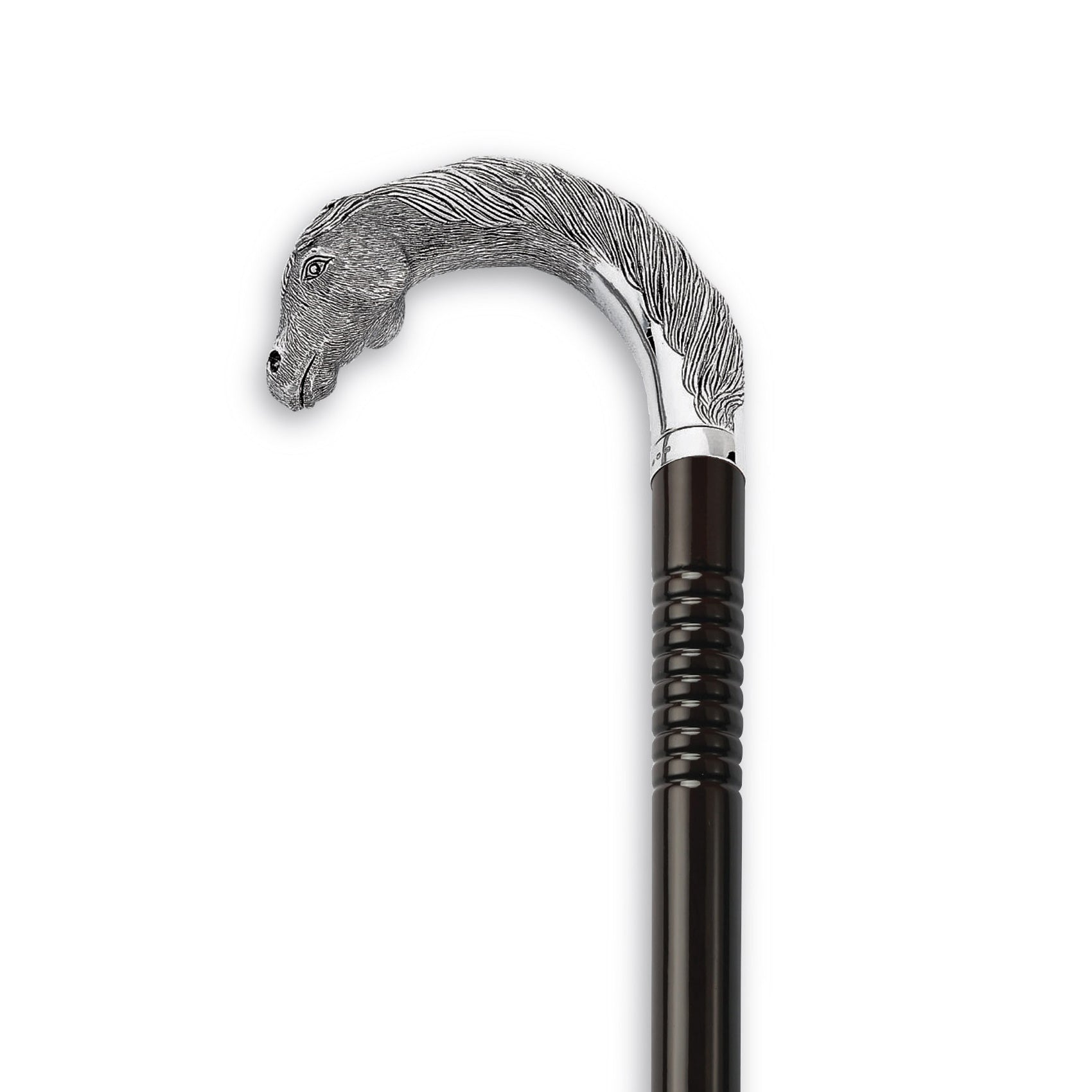 "Comyns' walking sticks are both decorative and functional and are used by many people to facilitate balance whilst walking or as a decorative accessory. The walking sticks are made from Burmese teak wood, featured here in walnut gloss. This walking stick features a sterling silvertip and neck ring, with a silver-coated handle in the shape of a horse.